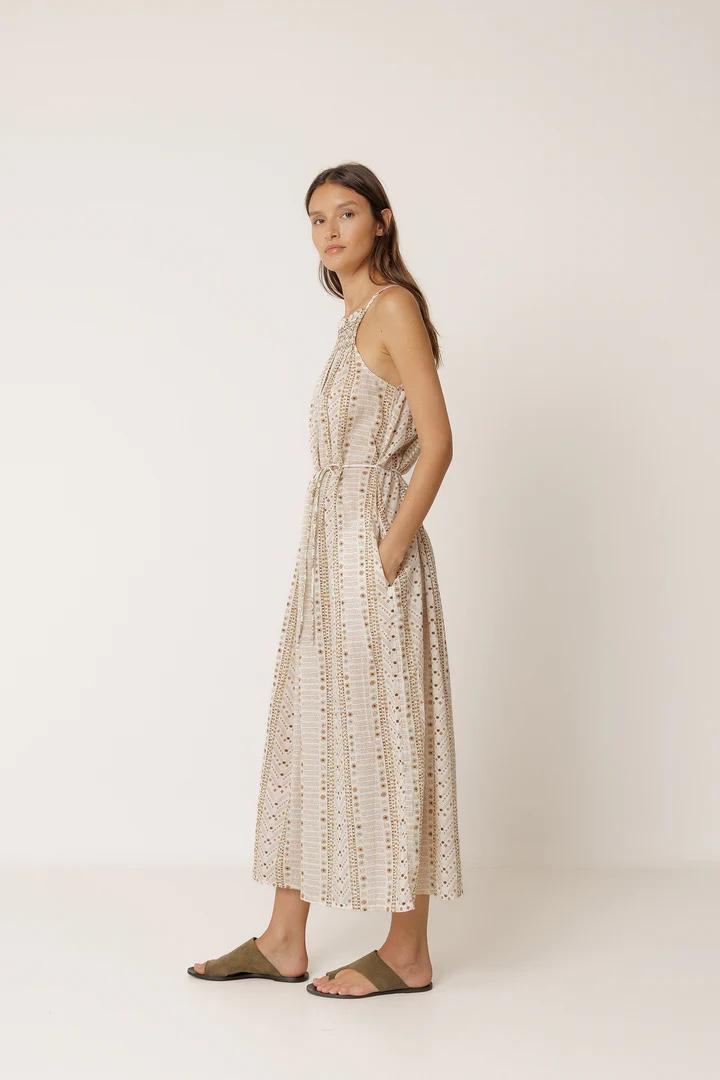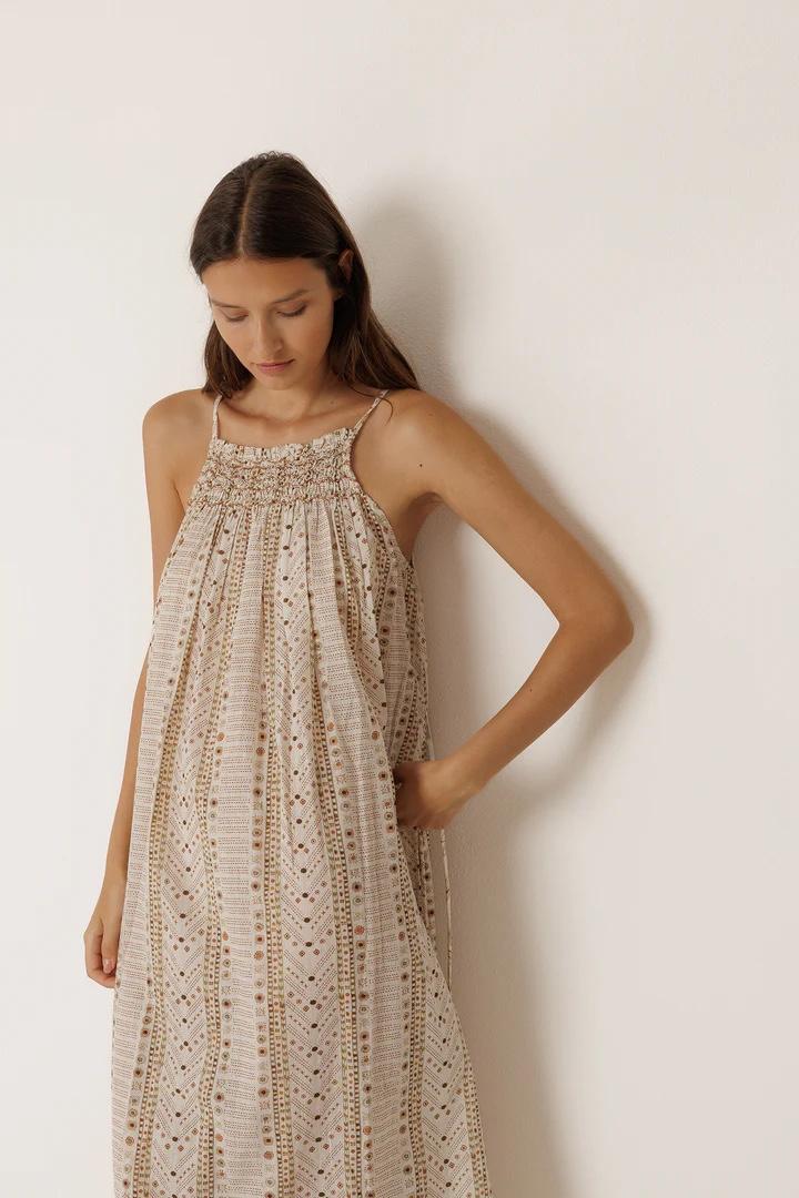 • Escote halter con frunce delantero. • Tirantes finos y hombros descubiertos. •Lazada ajustable y extraíble en la cintura. • Largo tobillero con caída fluida. • Estampados paisley y étnico sobre algodón orgánico. • Fit relajado: Diseñado para que siente ligeramente holgado. • Medidas sobre talla S en plano: Largo desde hombro 134cm. Ancho de pecho 46cm. Ancho de bajo 92cm. Tallaje: +1 cm de largo por talla y +2cm en contornos.