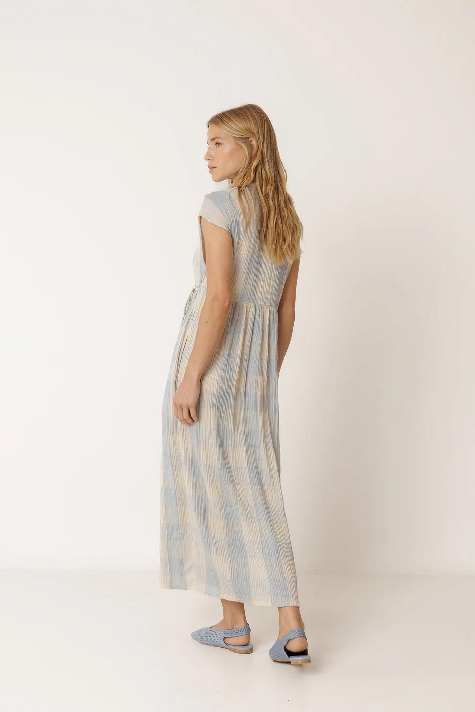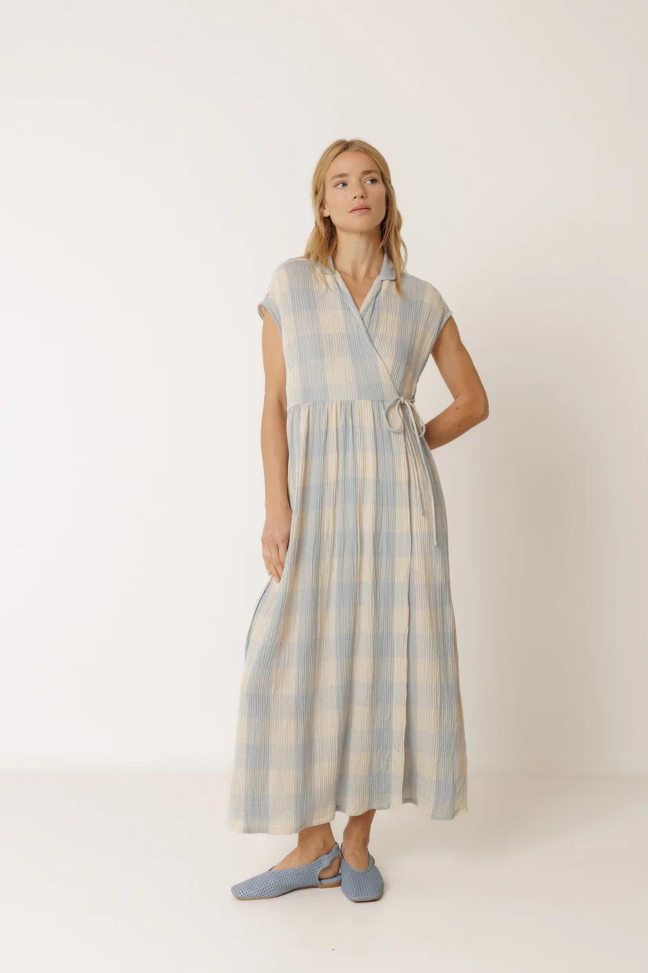 Vestido cruzado en cuadro vichy de viscosa y algodón, ligeramente transparente. Tiene el cuello solapa y cierre cruzado mediante lazada en la cintura, con bolsillos insertados en costura.