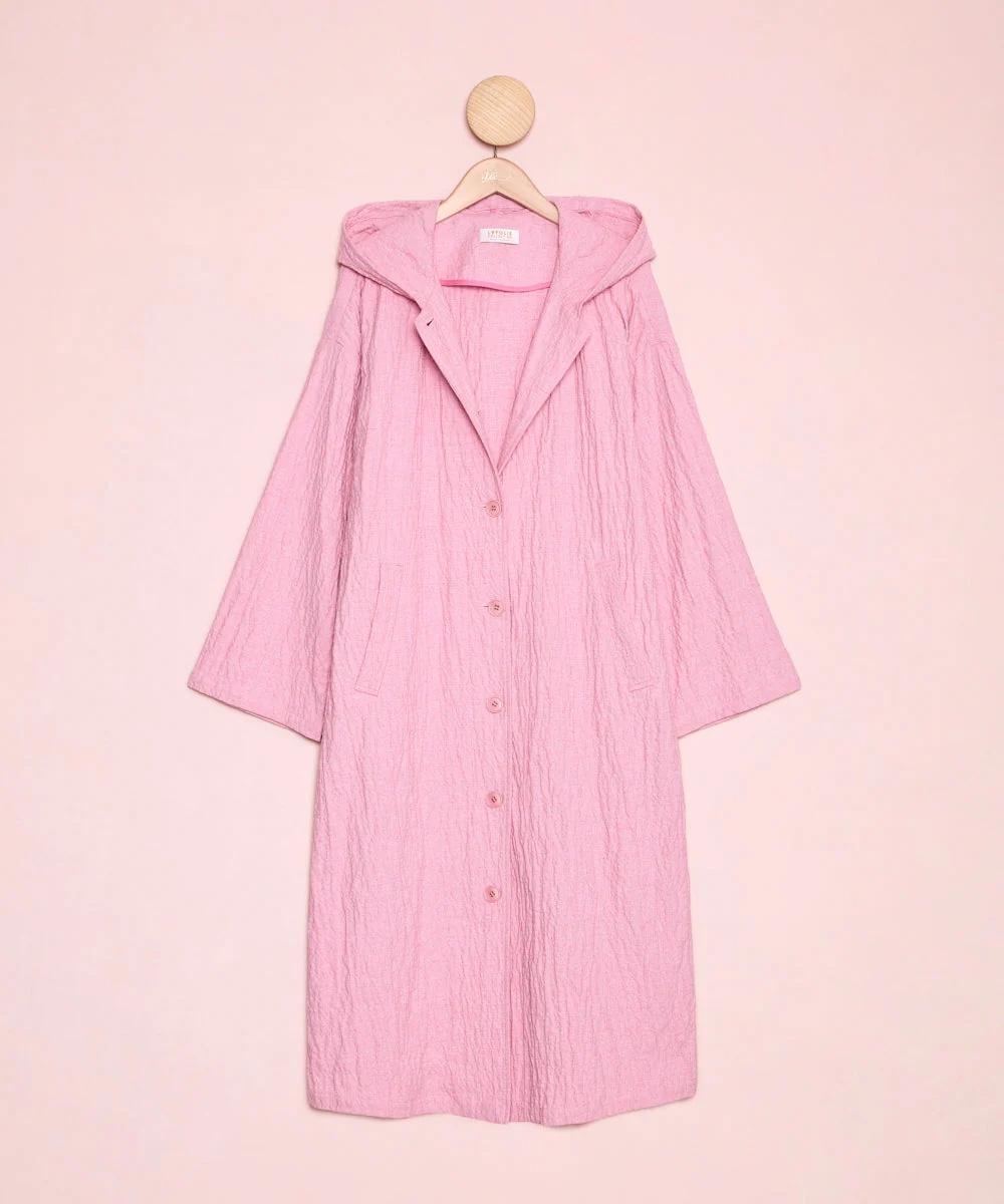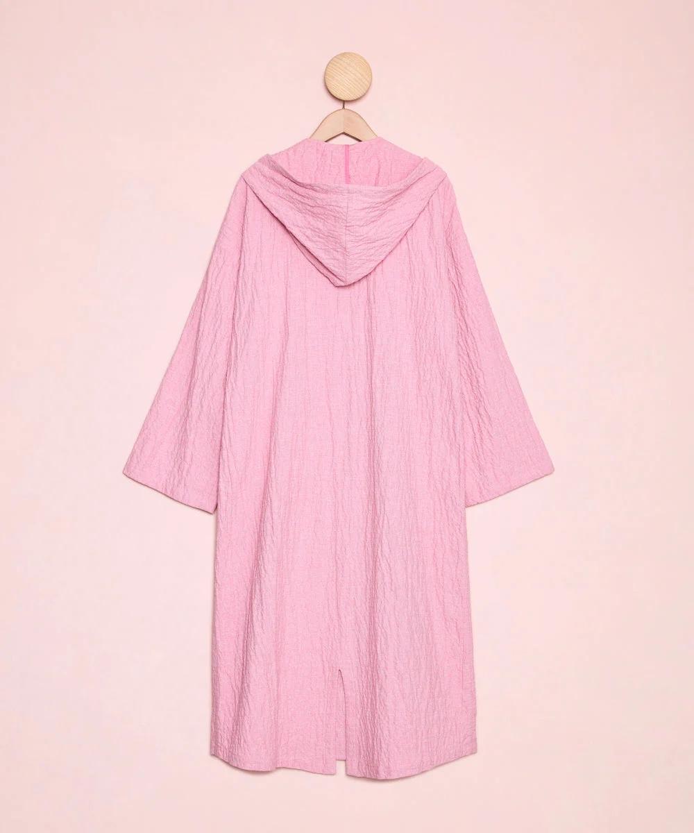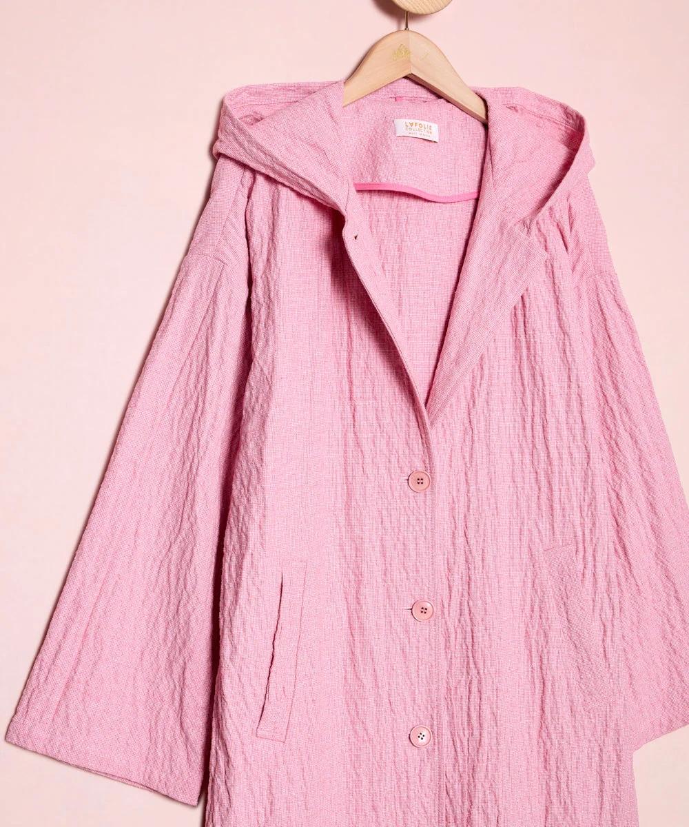 Gabardina larga en tejido seersucker rosa con capucha, solapas amplias, abotonadura central y bolsillos laterales. Silueta holgada y manga ancha.