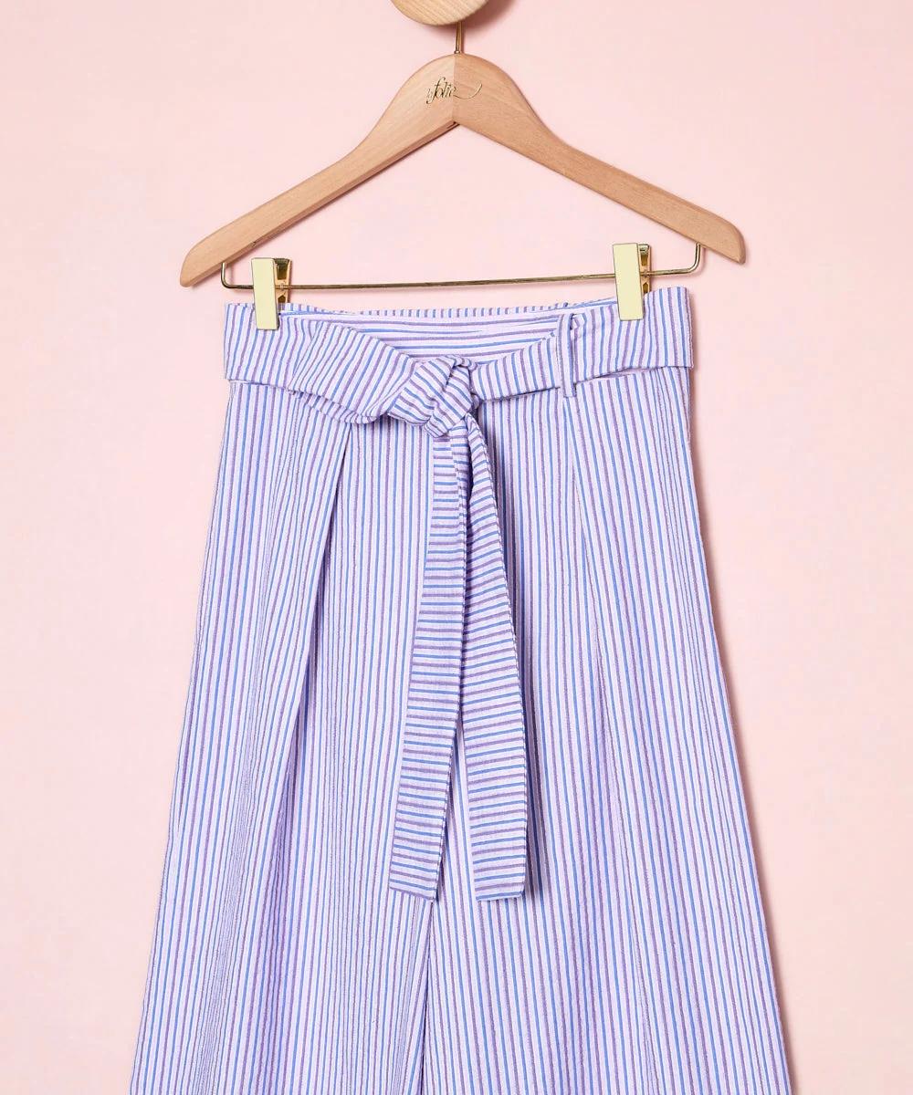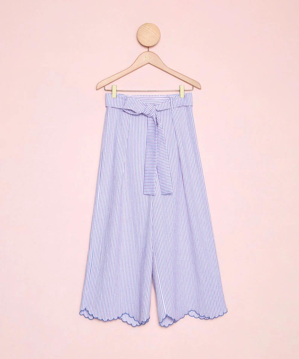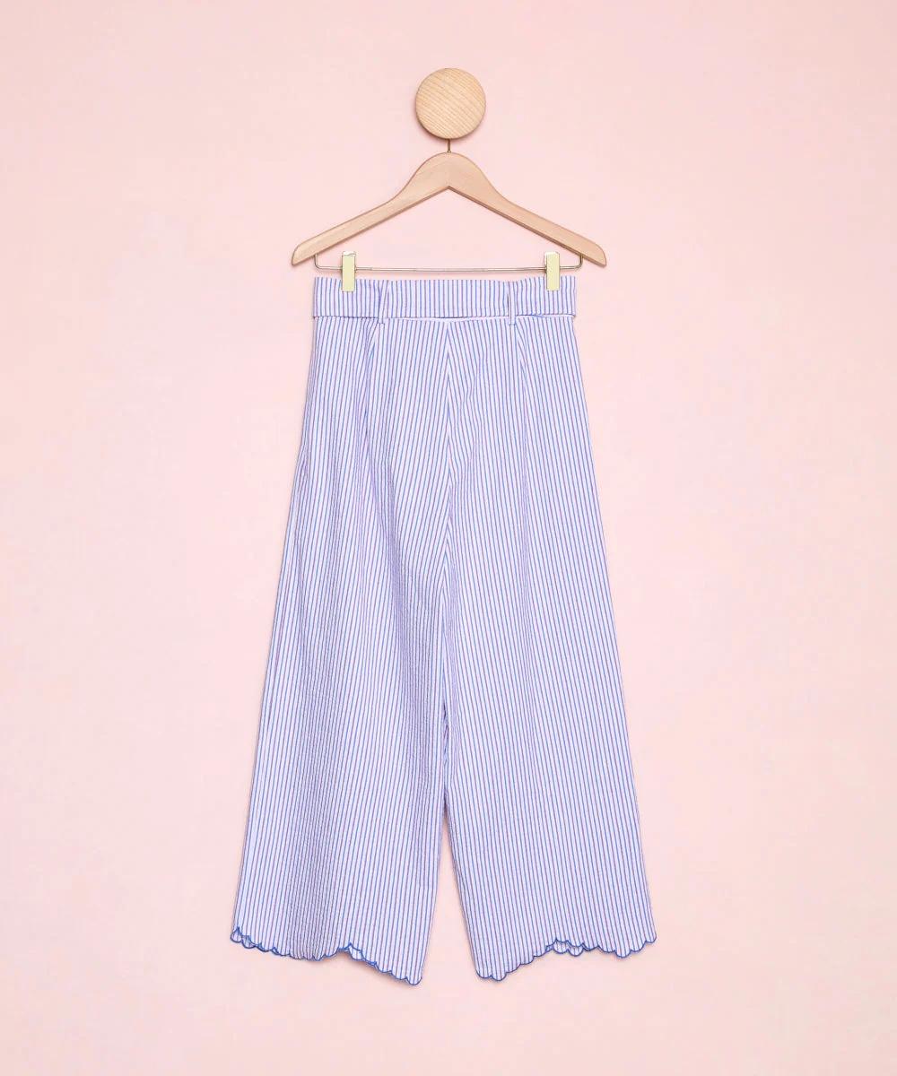 Pantalón de rayas tipo chino con pata ancha y bajo bordado con detalle de ondas.